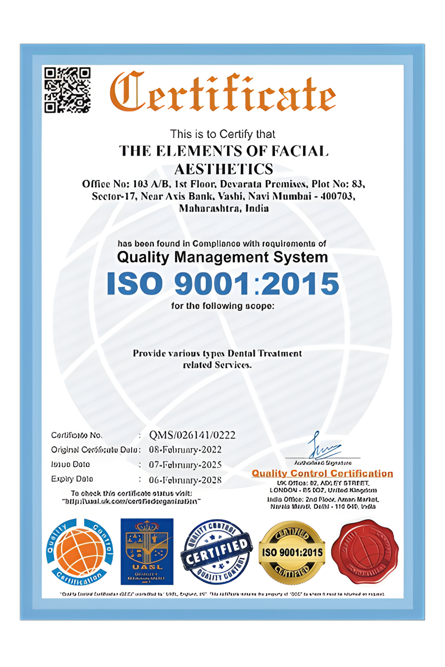 “The elements” is the only NABH accredited Super Specialty Dental Clinic in Navi Mumbai that is also QCI and ISO 9001:2015 certified for quality control and best services. Being one of the top dental clinics not only in in Vashi, Navi Mumbai, Mumbai but also Maharashtra, we operate on the principle of delivering the knowledge of diverse dental surgery specialists to offer the highest quality dental care to patients